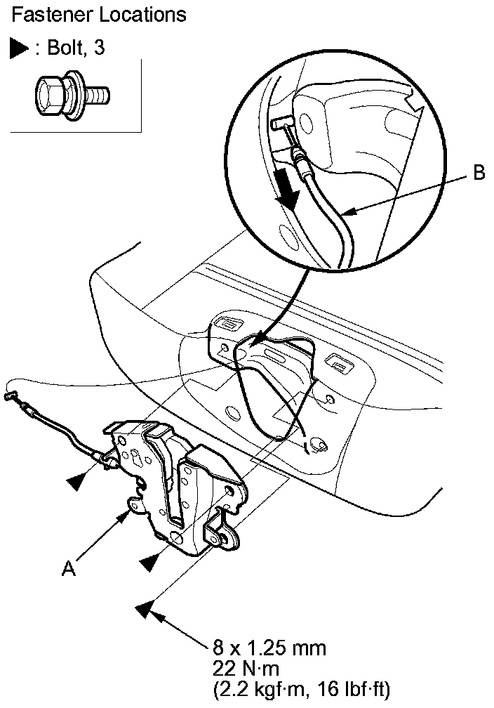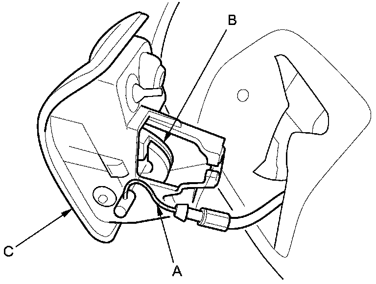 3. Disconnect the control cable (A) from the latch lever (B), and remove the latch cover (C). Take care not to bend the cable.