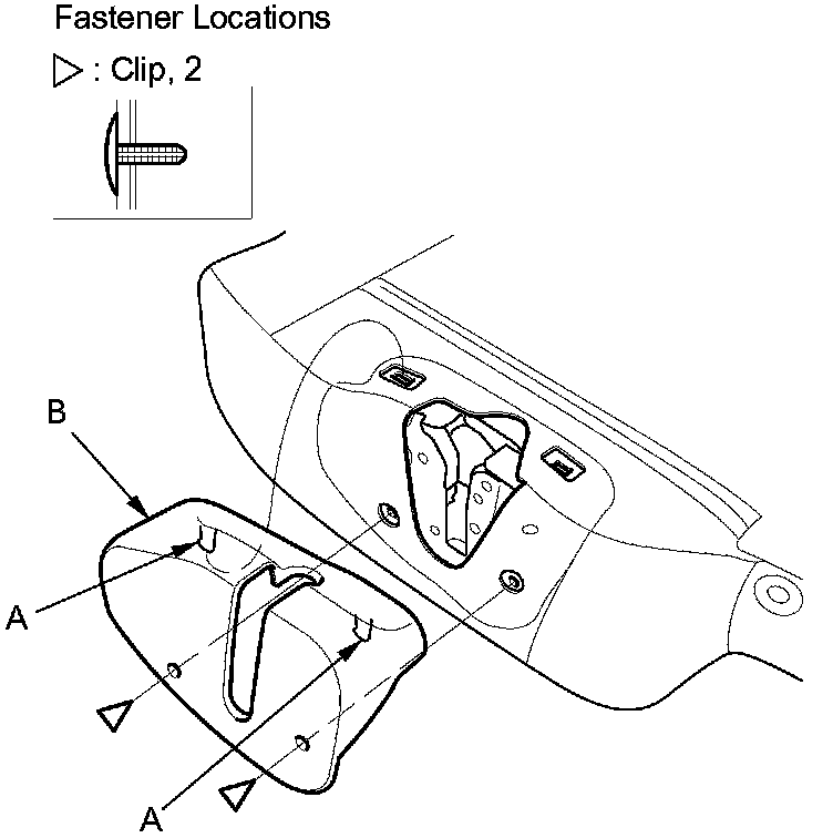 4. Detach the clips and the hooks (A), then remove the striker hole cover (B).