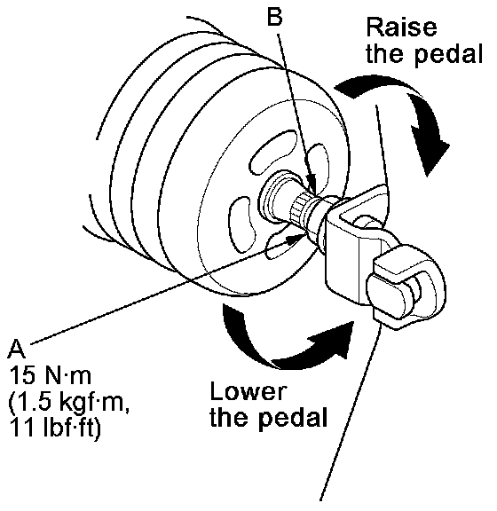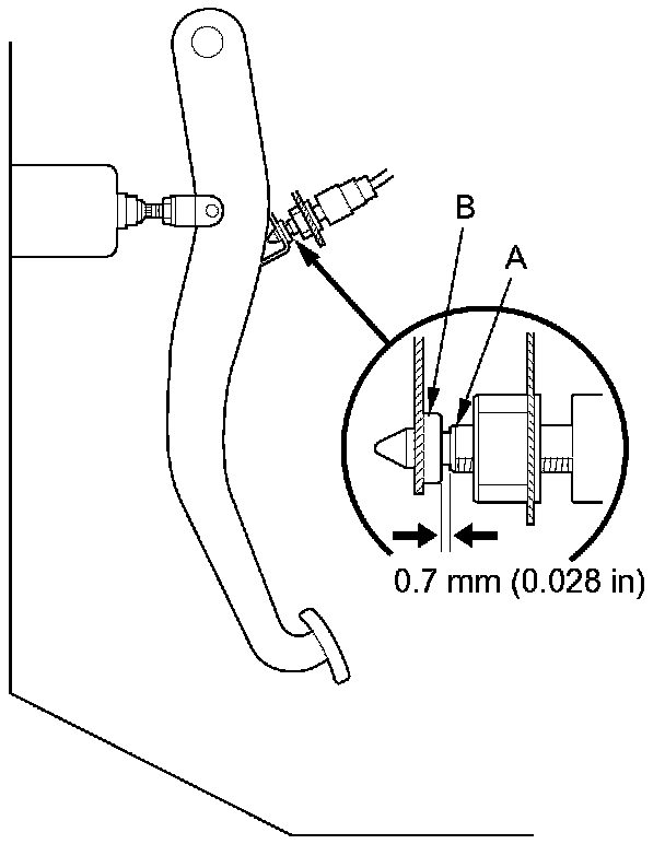 5. Lift up on the brake pedal by hand. Push in the brake pedal position switch until its plunger is fully pressed (threaded end (A) touching the pad (B) on the pedal arm). Turn the switch 45 ° clockwise to lock it. The gap between the brake pedal position switch and the pad is automatically adjusted to 0.7 mm(0.028 in) by locking the switch. Make sure the brake lights go off when the pedal is released.