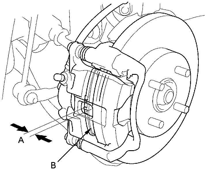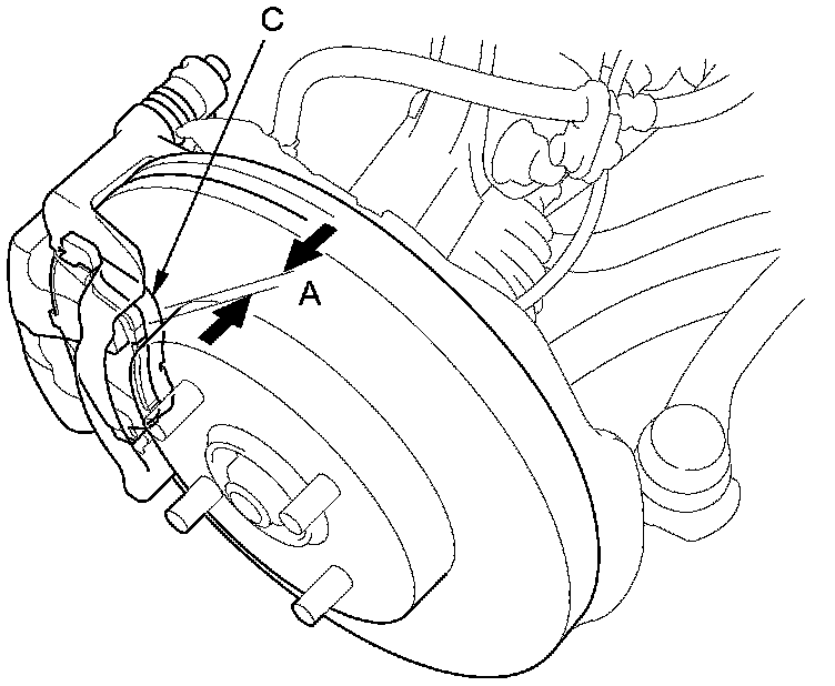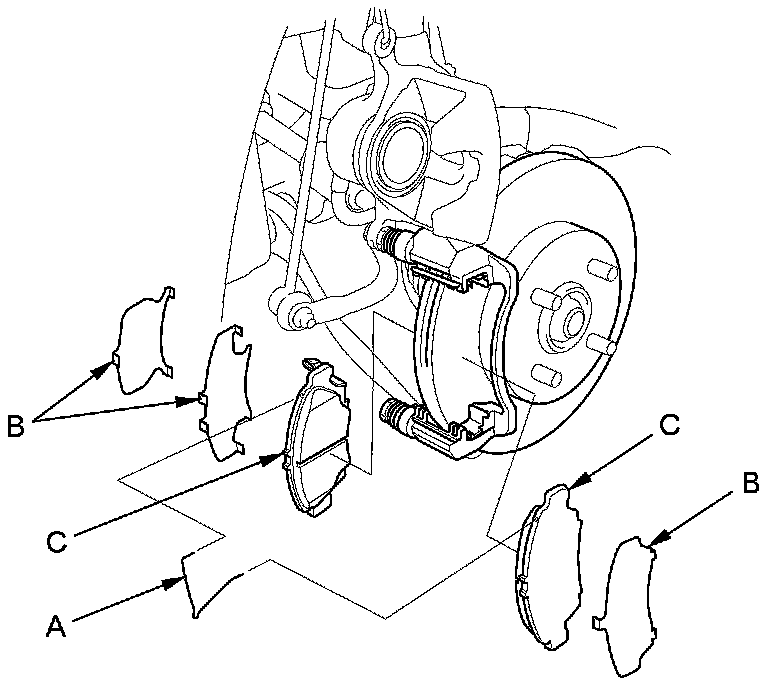 3. Check the thickness (A) of the inner pad (B) and the outer pad (C). Do not include the thickness of the backing plate.