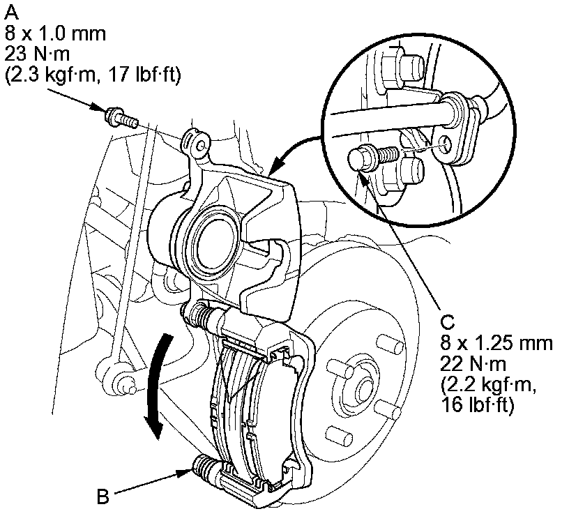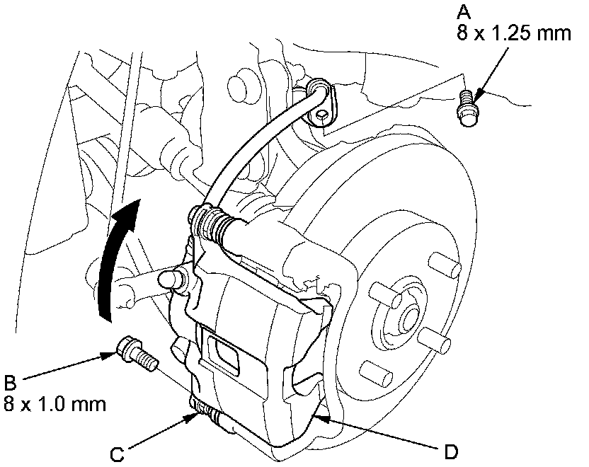 5. Remove the flange bolt (B) while holding the caliper pin (C) with a wrench. Be careful not to damage the pin boot, and pivot the caliper (D) up out of the way. Check the hose and the pin boots for damage and deterioration.