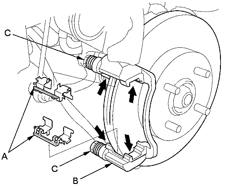 8. Clean the caliper bracket (B) thoroughly; remove any rust, and check for grooves and cracks. Verify that the caliper pins (C) move in and out smoothly. Clean and lube if needed.