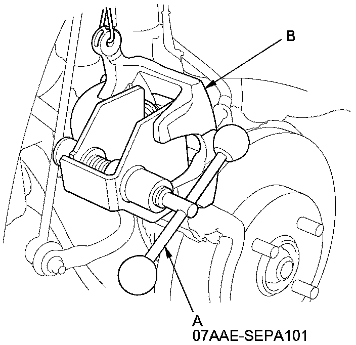 12. Mount a commercially available brake caliper piston compressor tool (A) on the caliper body (B).