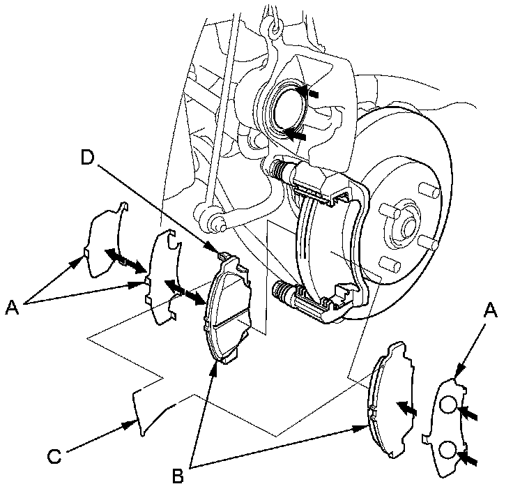 16. Install the brake pads, the pad shims and pad return spring (C) correctly. Install the brake pad with the wear indicator (D) on the upper inside. If you are reusing the brake pads, always reinstall the brake pads in their original positions to prevent a temporary loss of braking efficiency.