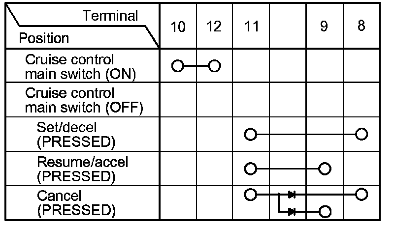- If there is continuity, and it matches the table, but the cruise control input test, indicated a faulty switch check and repair the wire harness on the switch circuit.