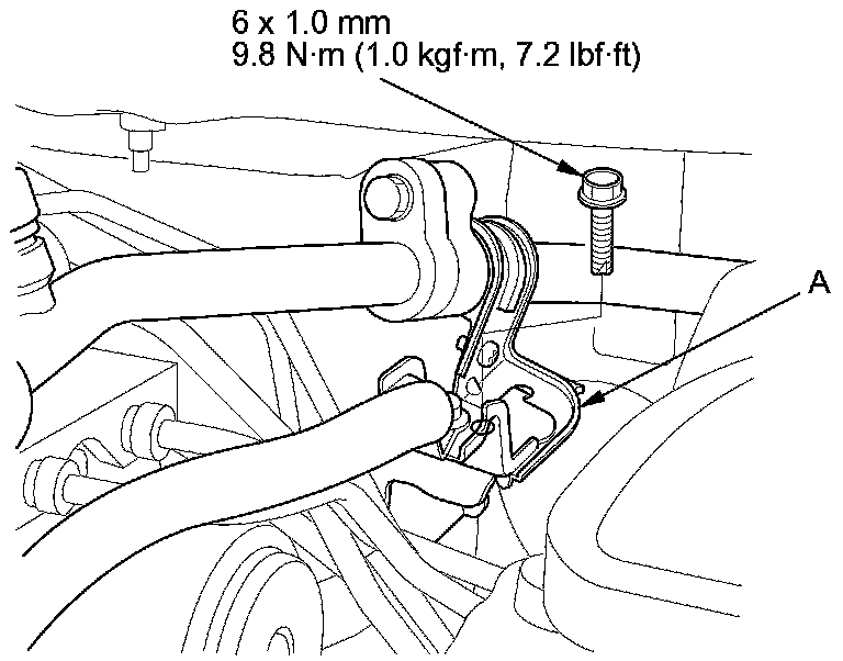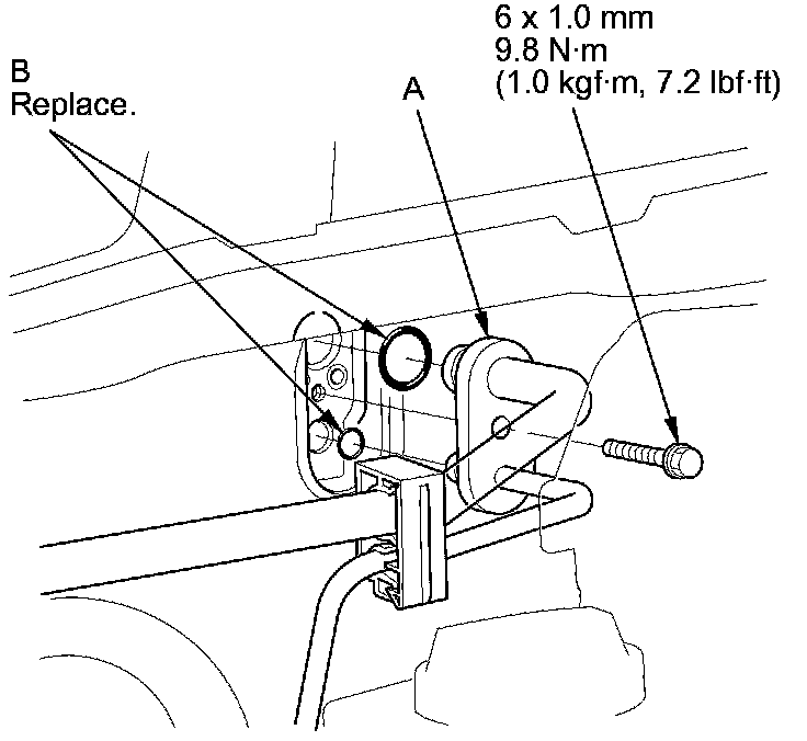 4. Remove the bolt, then disconnect the A/C line (A) from the evaporator core and remove the O-rings (B).