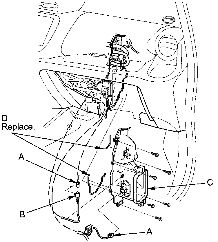 5. Disconnect the connectors (A) from the evaporator temperature sensor and the blower resistor, then remove the connector clip (B). Remove the self-tapping screws, the expansion valve cover (C), and the seals (D).