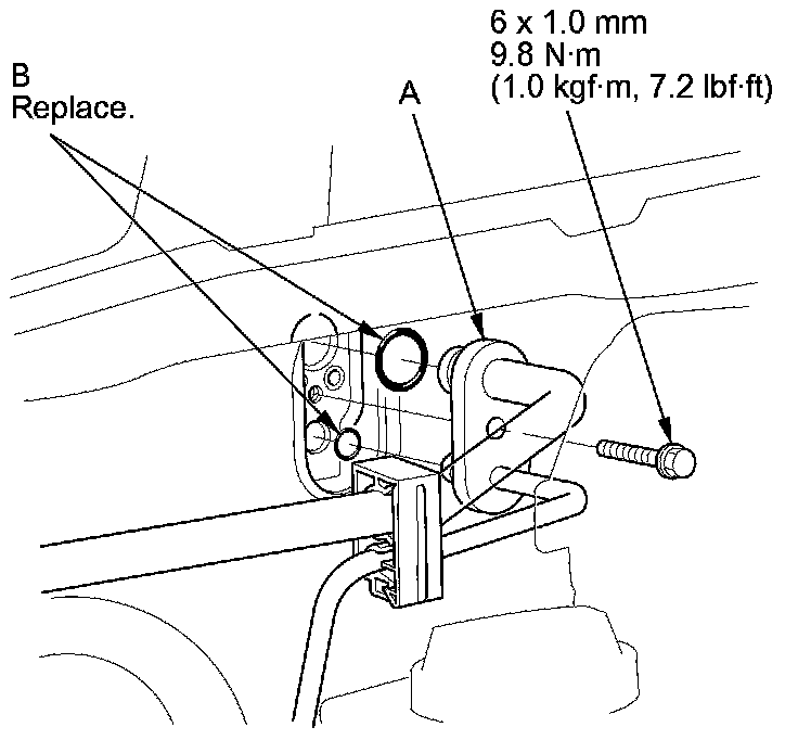 4. Remove the bolt, then disconnect the A/C line (A) from the evaporator core and remove the O-rings (B).