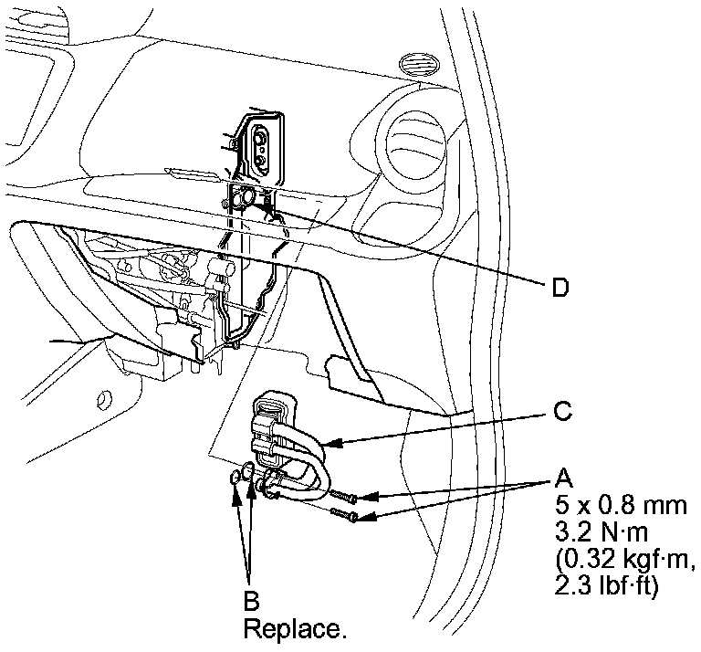 5. Disconnect the connectors (A) from the evaporator temperature sensor and the blower resistor, then remove the connector clip (B). Remove the self-tapping screws, the expansion valve cover (C), and the seals (D).
