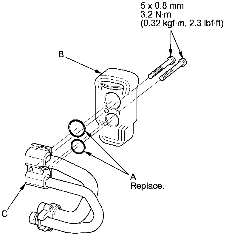 7. Remove the bolts, O-rings (A) and the expansion valve (B) from the inlet and outlet lines (C).
