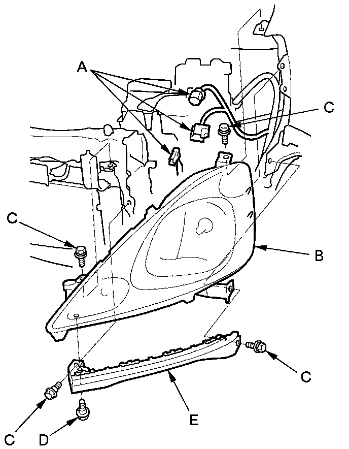 Remove the four mounting bolts (C) from the headlight.