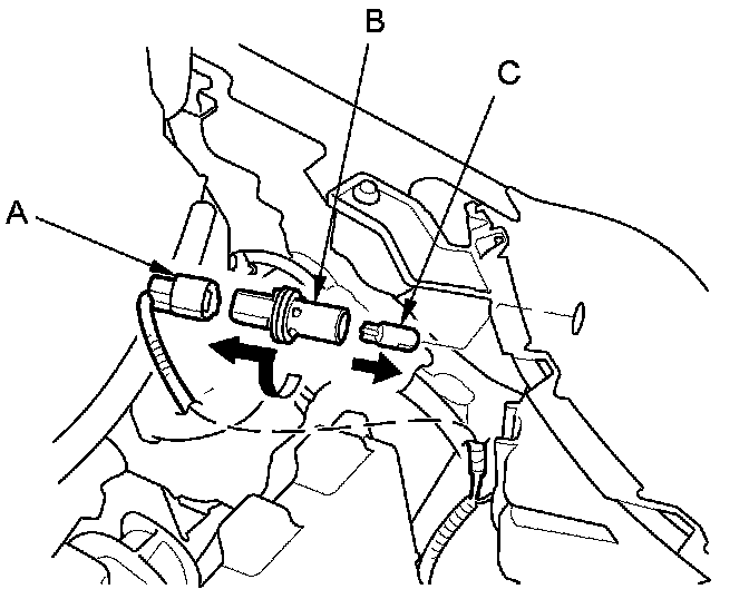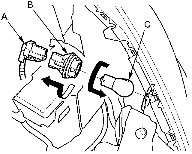 2. Turn the bulb socket (B) 45 ° counterclockwise to remove the bulb (C) from the headlight housing.