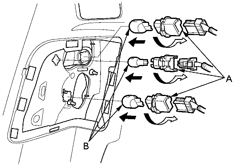 3. Turn the bulb socket (A) 45 ° counterclockwise to remove the bulb (B).