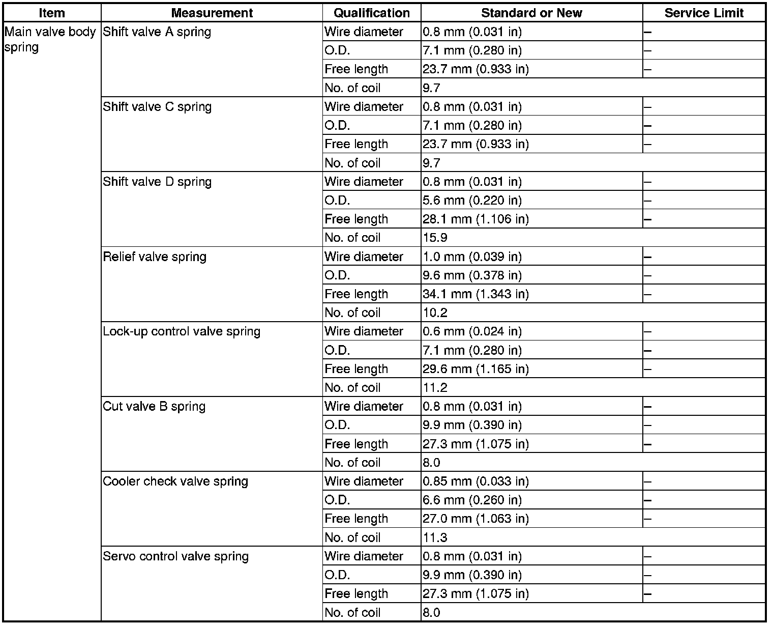 Main Valve Body spring Specification(s) (A/T)