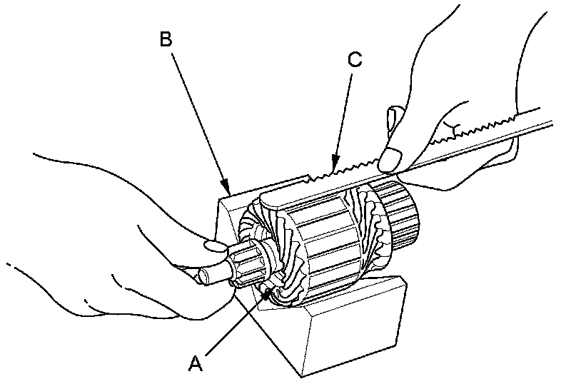 9. Place the armature (A) on an armature tester (B). Hold a hacksaw blade (C) on the armature core. If the blade is attracted to the core while the core is turned, the armature is shorted. Replace the armature.