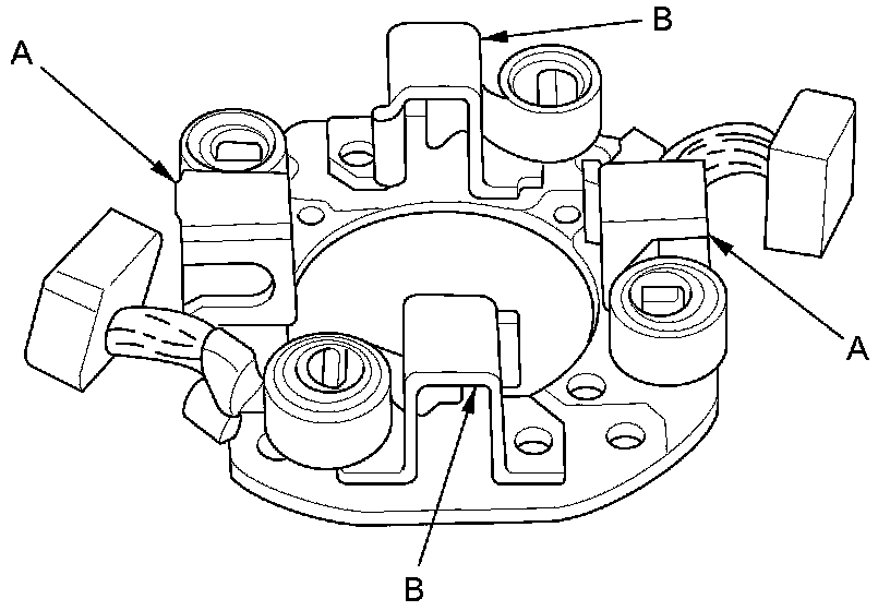 14. Check for continuity between the (+) brush holder (A) and (-) brush holder (B). If there is continuity, replace the brush holder assembly.