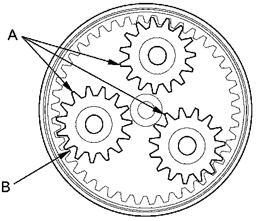 19. Check the planetary gears (A) and internal ring gear (B). Replace them if they are worn or damaged.