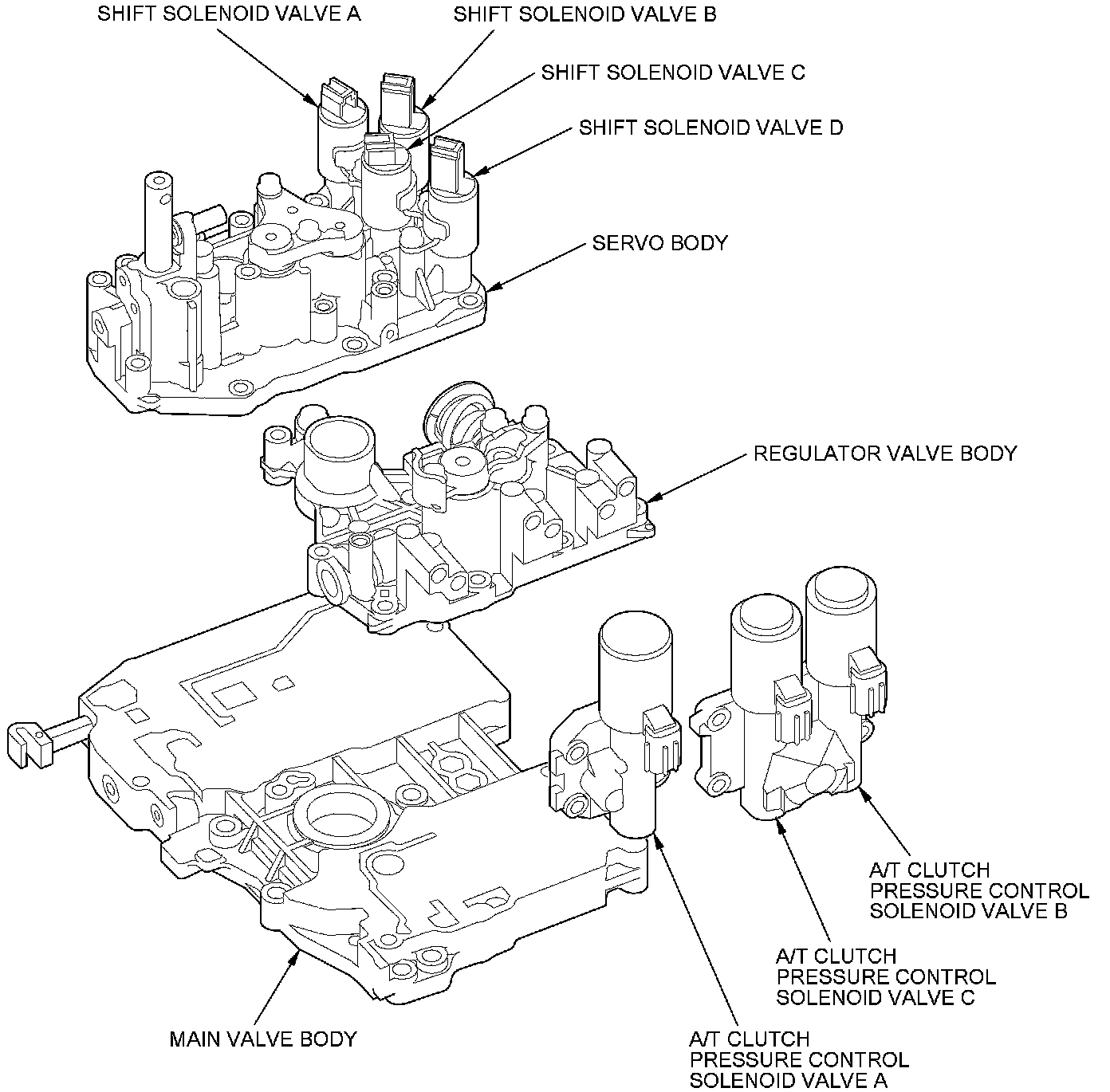 The valve body includes the main valve body, the regulator valve body, and the servo body. The ATF pump is driven by splines on the end of the torque converter which is attached to the engine. Fluid flows through the regulator valve to maintain specified pressure through the main valve body to the manual valve, directing pressure to each of the clutches. Shift solenoid valves A, B, C, and D are mounted on the servo body. A/T clutch pressure control solenoid valves A, B, and C are mounted on the transmission housing.
