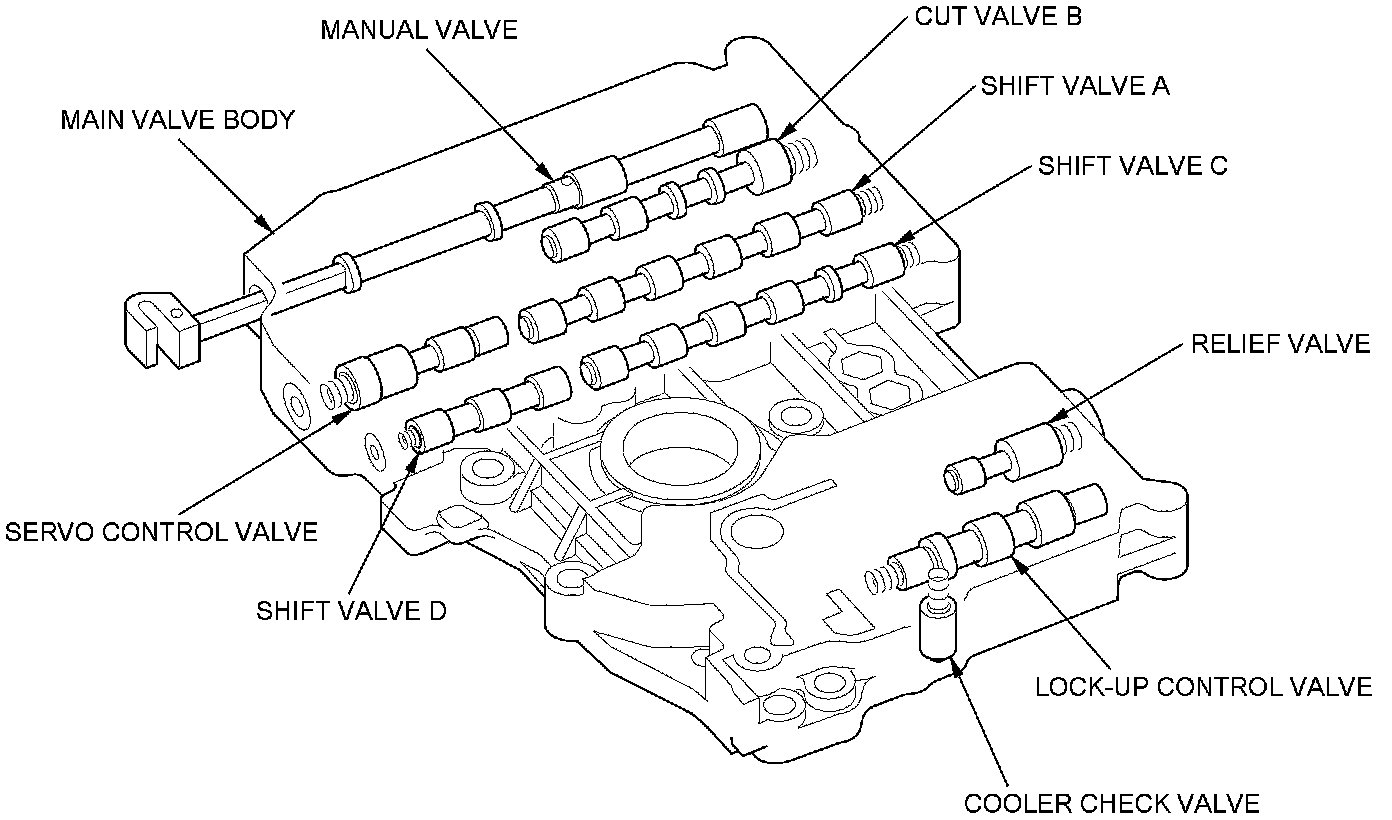 The main valve body contains the manual valve, cut valve B, shift valves A, C, and D, the relief valve, the lock-up control valve, the cooler check valve, the servo control valve, and the ATF pump gears. The primary function of the main valve body is to switch fluid pressure on and off to control hydraulic pressure going to the hydraulic control system.