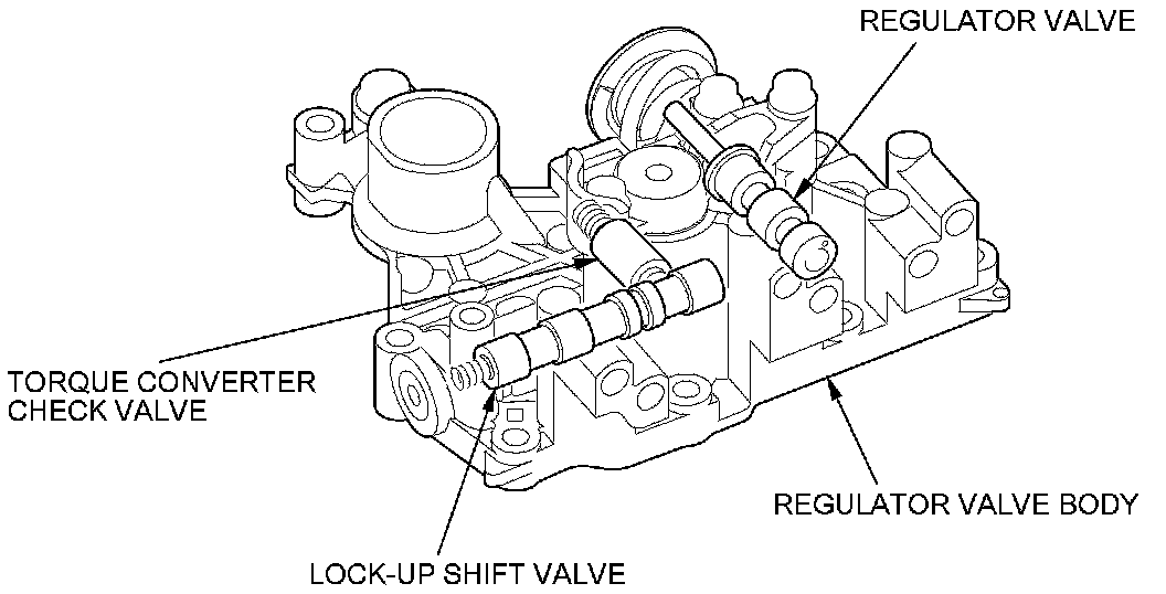 The regulator valve body is located on the main valve body. The regulator valve body contains the regulator valve, the torque converter check valve, the lock-up shift valve, the 1st accumulator, and the 4th accumulator.