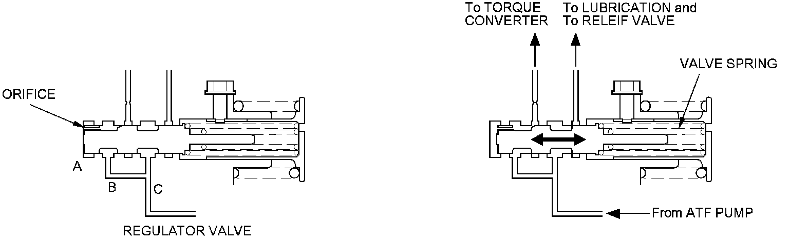 The regulator valve maintains constant hydraulic pressure from the ATF pump to the hydraulic control system. While also furnishing fluid to the lubrication system and torque converter. Fluid from the ATF pump flows through B and C. Fluid entering from B flows through the valve orifice to the A cavity. This pressure in the A cavity pushes the regulator valve to the spring side, and this movement of the regulator valve uncovers the fluid port to the torque converter and the relief valve. The fluid flows out to the torque converter and the relief valve, and the regulator valve returns under spring force. According to the level of the hydraulic pressure through B, the position of the regulator valve changes, and the amount of fluid from C through the torque converter changes. This operation is continued, maintaining the line pressure.