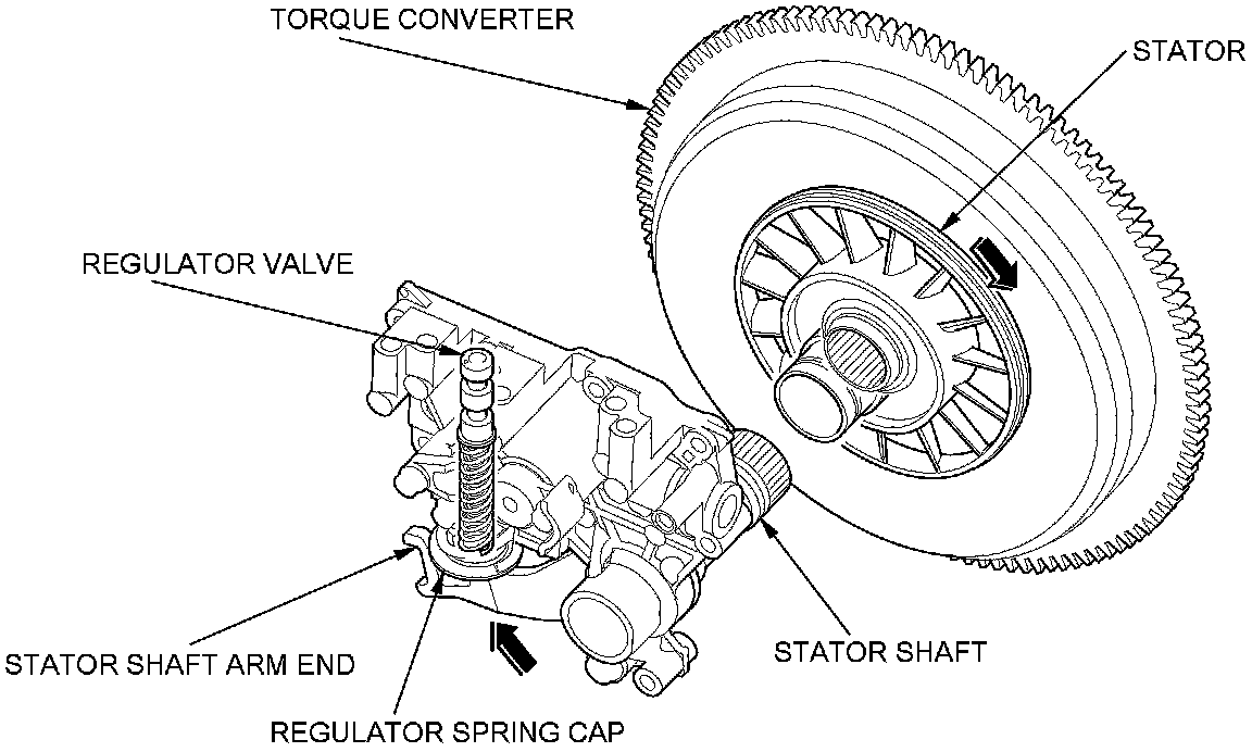 Increases in hydraulic pressure according to torque are regulated by the regulator valve using stator torque reaction. The stator shaft is splined to the stator in the torque converter, and the stator shaft arm end contacts the regulator spring cap. When the vehicle is accelerating or climbing (torque converter range), stator torque reaction acts on the stator shaft, and the stator shaft arm end pushes the regulator spring cap in the direction of the arrow in proportion to the reaction. The stator reaction spring compresses, and the regulator valve moves to increase the line pressure which is regulated by the regulator valve. The line pressure reaches its maximum when the stator torque reaction reaches its maximum.