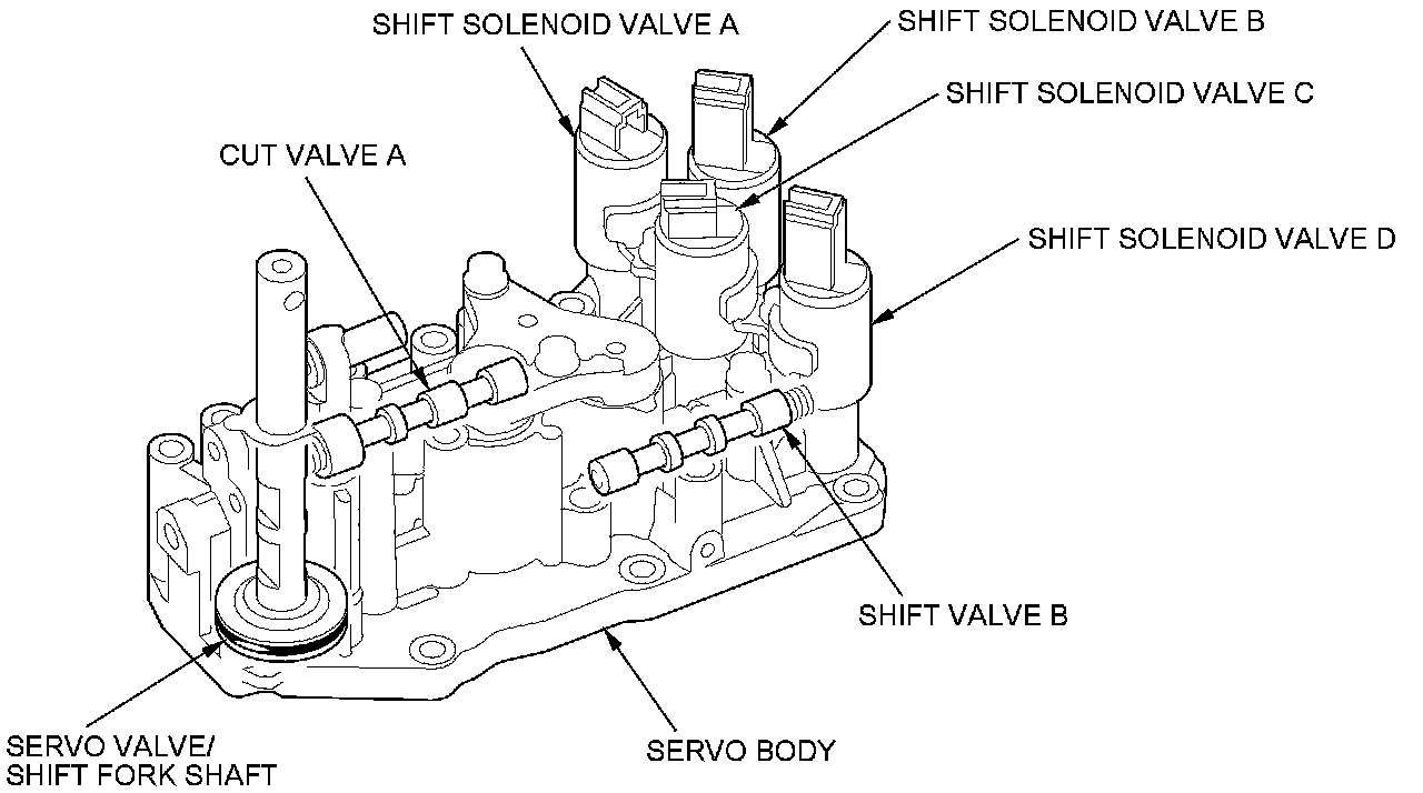The servo body is on the main valve body. The servo body contains the servo valve, shift valve B, cut valve A, accumulators for 2nd, 3rd, and 5th, and shift solenoid valves A, B, C, and D.