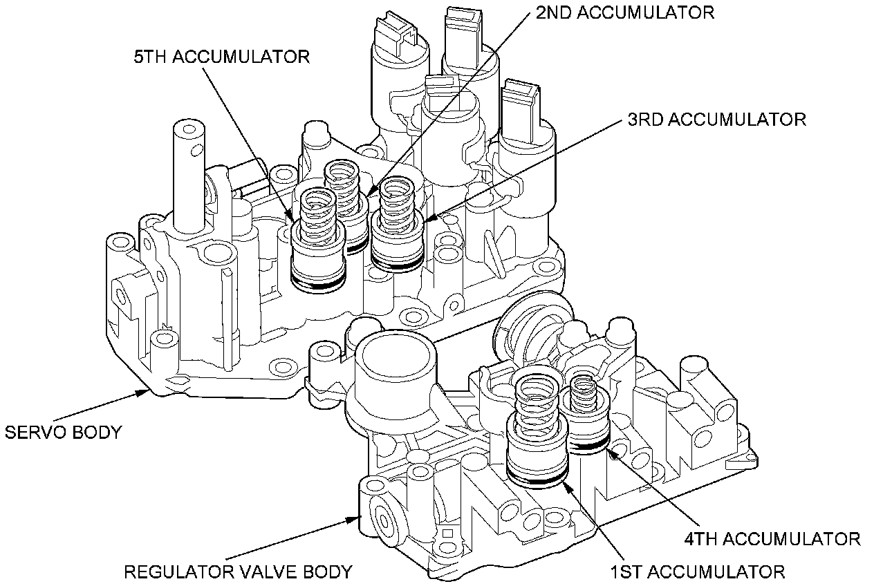 The accumulators are located in the regulator valve body and servo body. The regulator valve body contains the 1st and 4th accumulators, and the servo body contains the 2nd, 3rd, and 5th accumulators.