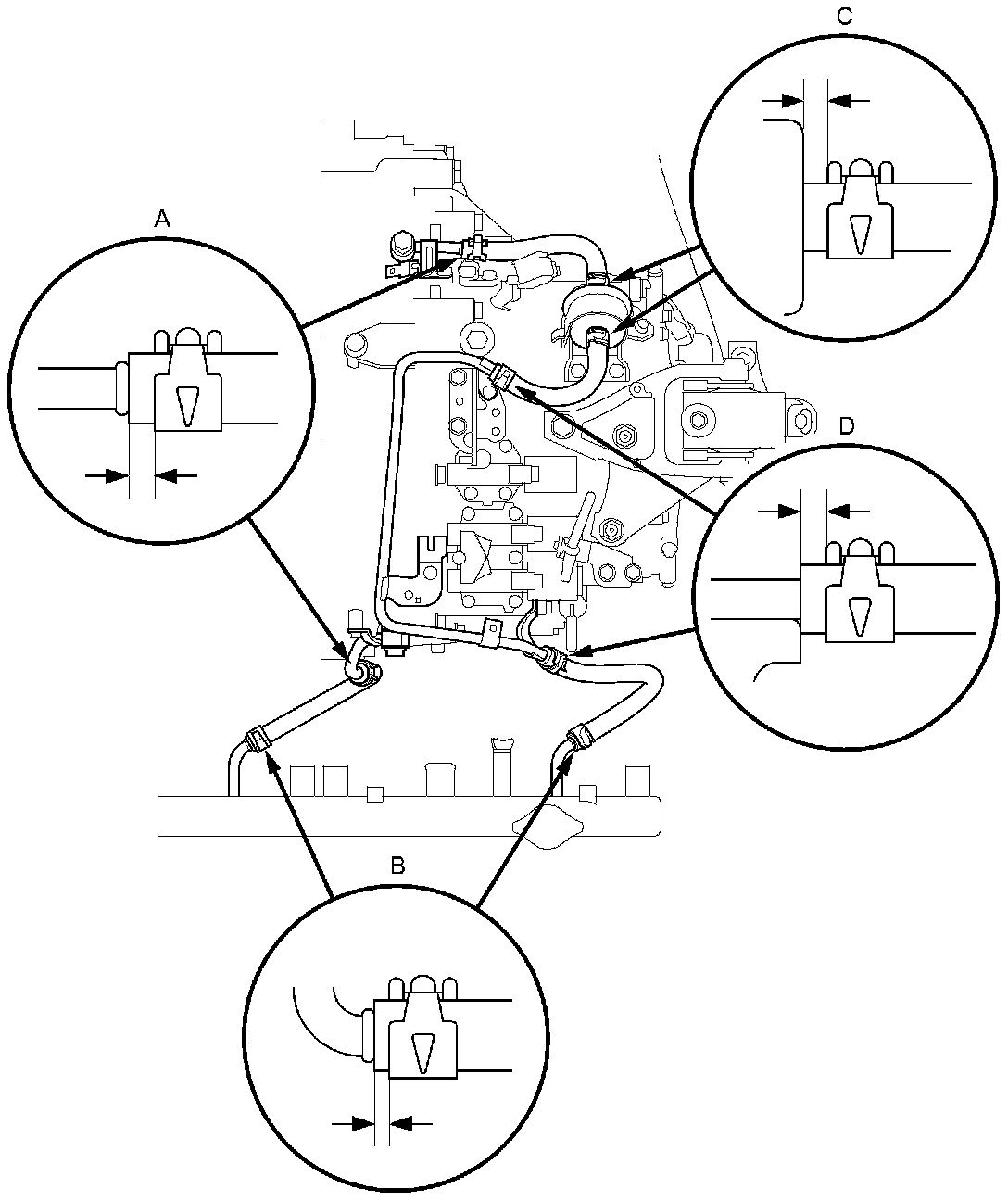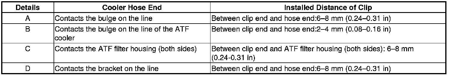 Install the ATF cooler hoses over the ATF cooler lines, and secure the hoses with the clips as shown in the details (A) (B) (C) (D), shown in the following figure. Keep the tabs of the clips clear of other parts.