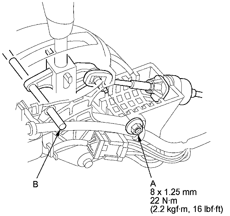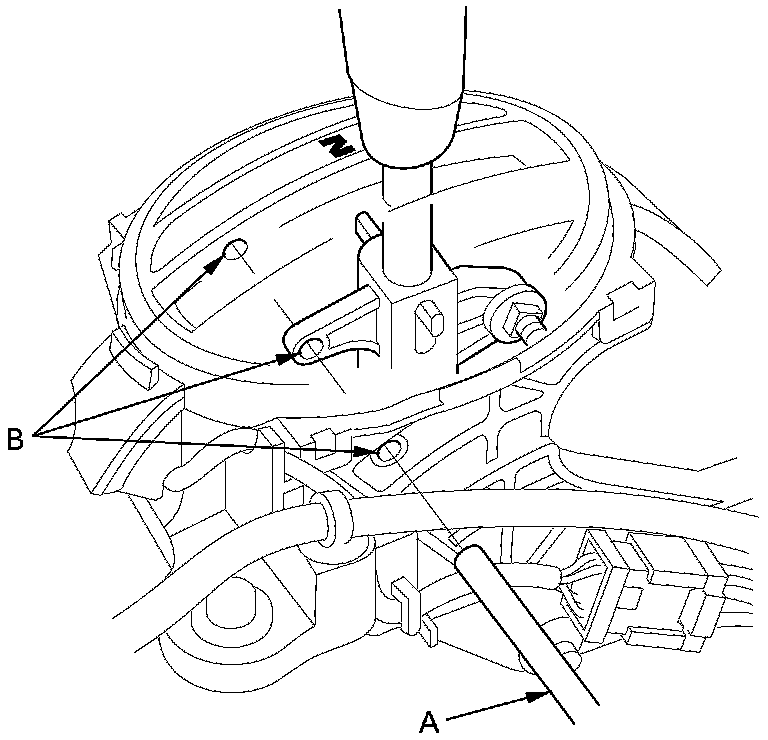 8. Insert a 6.0 mm (0.24 in) pin (A) through the positioning holes (B) on the shift lever bracket base and into the positioning hole on the shift lever. Use only the 6.0 mm (0.24 in) pin.