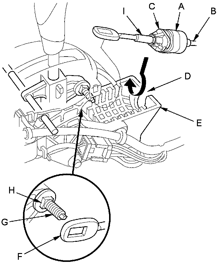 10. Rotate the socket holder (A) on the shift cable (B) to place the corner (C) on the holder opposite the opening (D) in the shift lever bracket base (E). Align the holder with the opening in the bracket, then slide the holder into the bracket. Install the shift cable end (F) over the mounting stud (G) by aligning its square hole with the square fitting (H) at the bottom of the stud. Rotate the holder a quarter turn until the holder stops to secure the shift cable. Do not install the shift cable by twisting the shift cable guide (I).