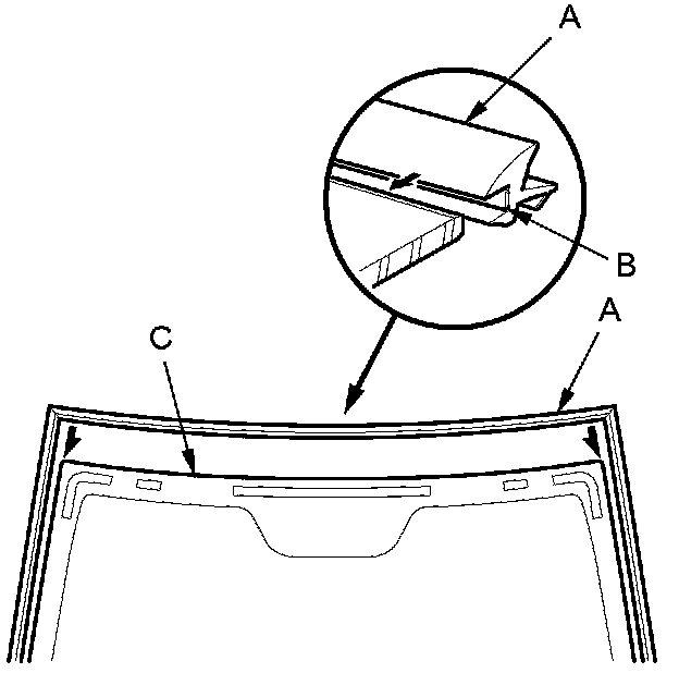 13. Keep water, dust, and abrasive materials away from the primed surfaces. Attach the molding (A) with adhesive tape (B) to the edge of the windshield (C):