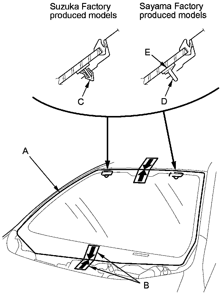 Make alignment marks (B) across the windshield and body with a grease pencil at the four points shown. Make sure both upper clips (C) are in the body holes (Suzuki Factory produced models). Make sure both pins (D) from the upper clips (E) contact the edge of the body holes (Sayama Factory produced models). Be careful not to touch the windshield where adhesive will be applied.