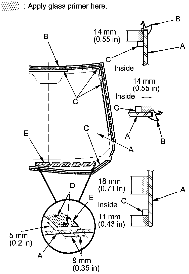 - Apply glass primer to the bottom (E) of the windshield, using the printed dots (D) on the windshield as a guide.