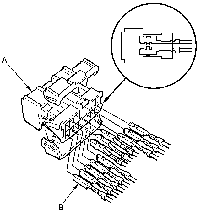 5. Disassemble the power mirror connector (A), and remove the terminals (B) from the connector.