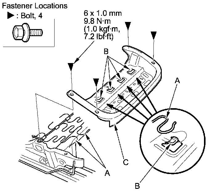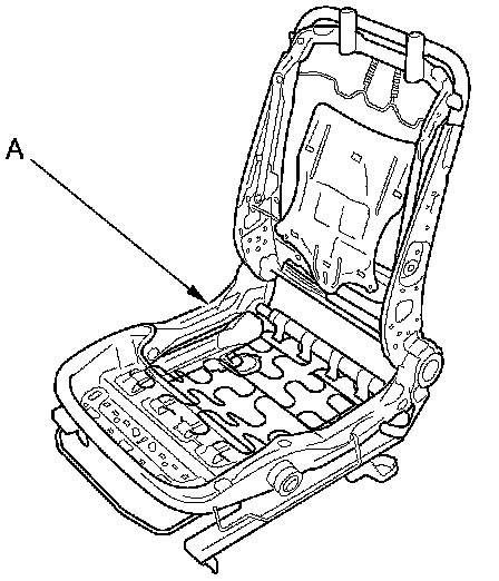 4. If necessary, remove the bolts, and release the seat cushion springs (A) from the hooks (B), then remove the seat cushion frame (C).