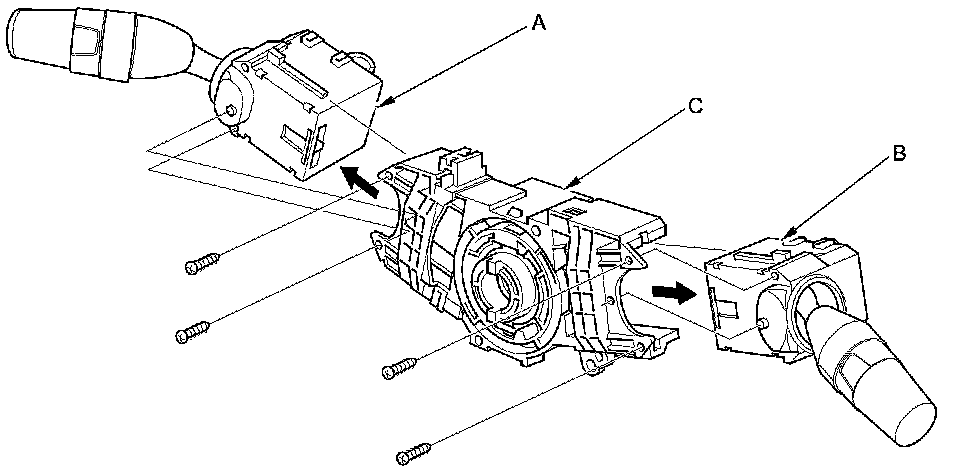 4. Remove the combination light switch (A) and the wiper/washer switch (B) from the combination switch body assembly (C).