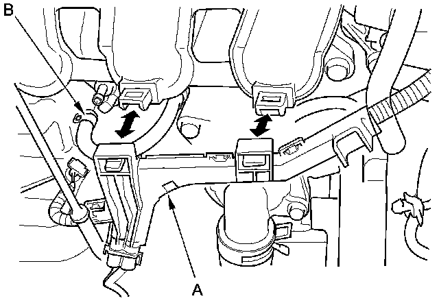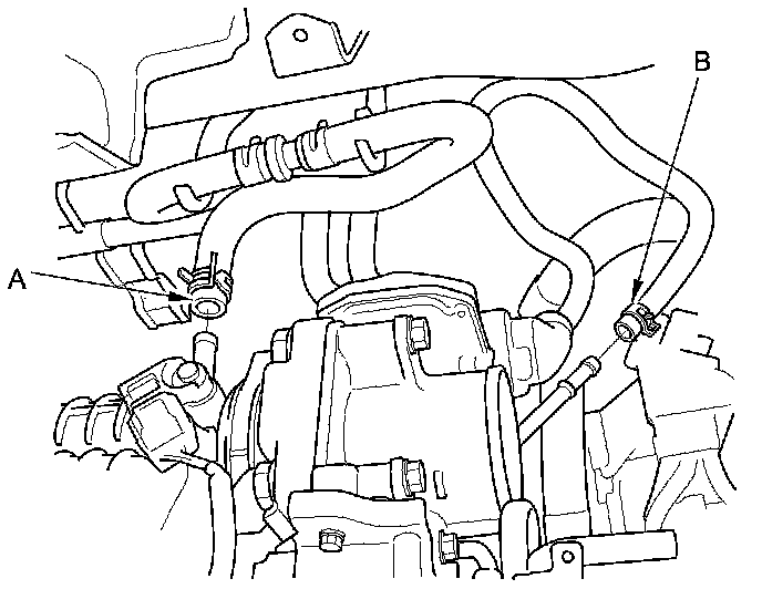 4. Remove the brake booster vacuum hose (A) and the EVAP canister hose (B).