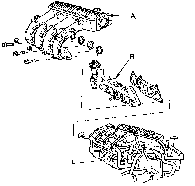 4. Loosen the intake manifold bracket mounting bolt (A). Tighten the mounting bolts (B), then tighten the mounting bolt (A).