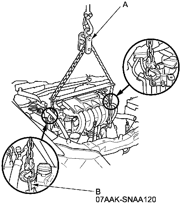 - Attach the first universal lifting eyelet (B) to the cam chain case.