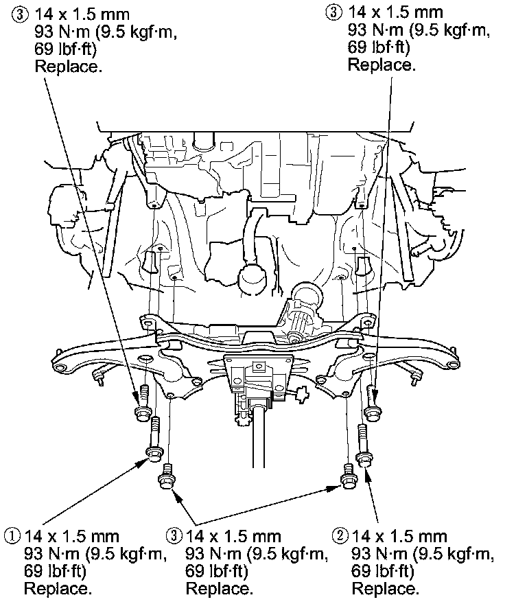 13. Install the front subframe, then tighten the new front subframe mounting bolts in the numbered sequence shown.