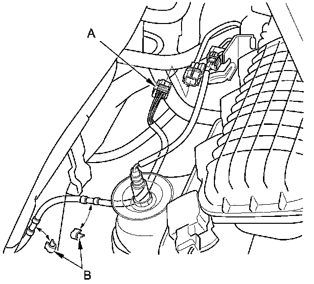 43. Connect the secondary HO2S connector (A), then install the secondary HO2S harness to the clamps (B).