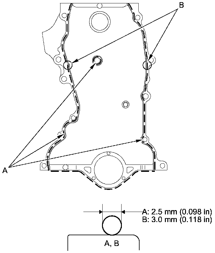 - Apply a 3.0 mm (0.118 in) diameter bead of liquid gasket to the upper surface contact areas of the engine block (B).