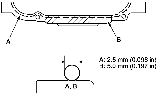 - Apply a 5.0 mm (0.20 in) diameter bead of liquid gasket to the shaded area (B).