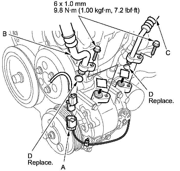 6. Remove the compressor clutch connector (A) from the condenser fan shroud, then disconnect the connector. Remove the bolts, then disconnect the suction line (B) and the discharge line (C) from the compressor, and remove the O-rings (D). Plug or cap the lines immediately after disconnecting them to avoid moisture and dust contamination.