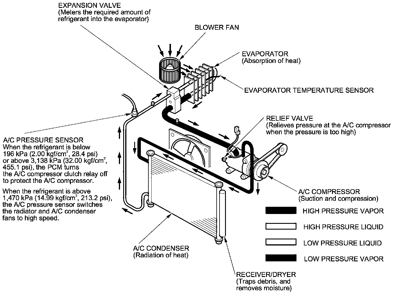 - All A/C system parts (A/C compressor, discharge line, suction line, evaporator, A/C condenser, receiver/dryer, expansion valve, O-rings for joints) are designed for refrigerant R-134a.