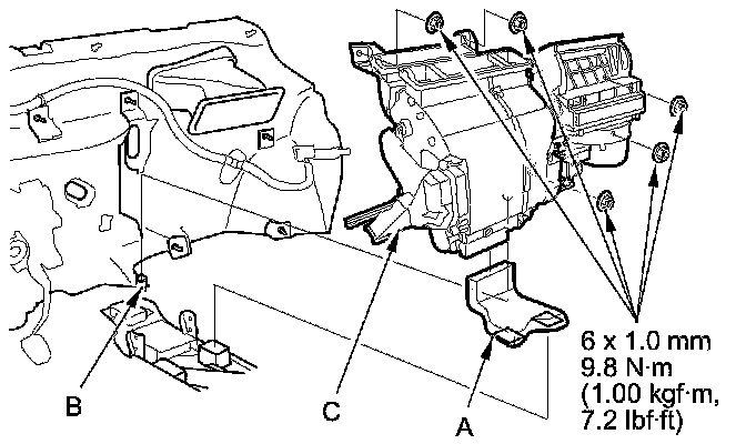 9. Remove the self-tapping screws and the heater core cover (A), the cap (B), and the grommet (C), and carefully pull out the heater core (D).