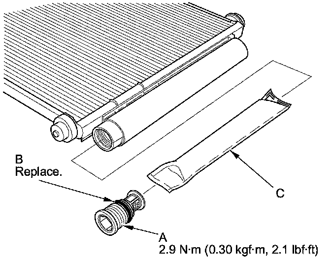 2. Remove the cap (A) from the bottom of the A/C condenser. Remove the O-ring (B) and the desiccant (C).
