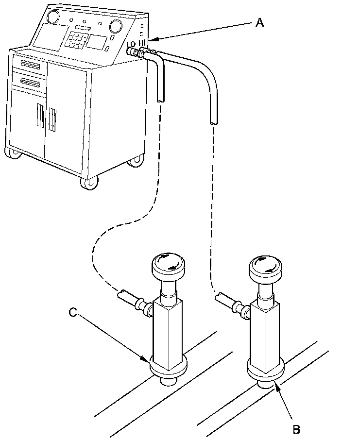 1. Connect an R-134a refrigerant recovery/recycling/charging station (A) to the high-pressure service port (B) and the low-pressure service port (C), as shown, following the equipment manufacturer's instructions.