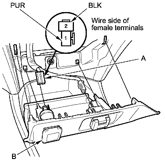 2. Disconnect the 2P connector (A) from the accessory power socket (B).